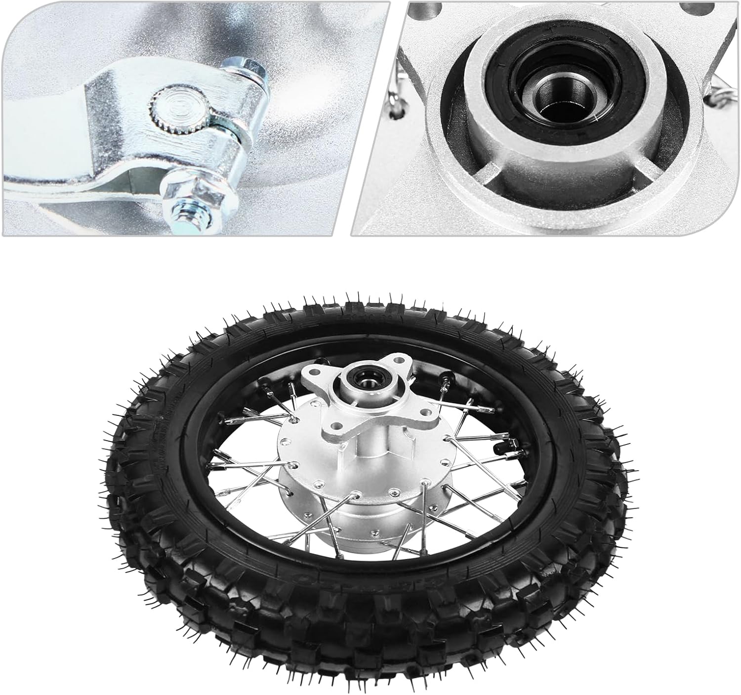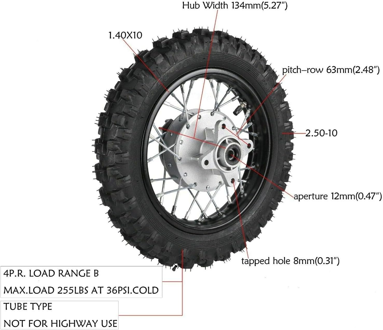 SpecificationMaterial: Rubber, Aluminum, SteelProcess: Spray Painting, Precision Machining, Die-castingColor: BlackStyle: ModernCondition: New Wheel Type: Inflatable TirePlacement on Vehicle: RearFitment Type: Direct ReplacementNot Suitable for: HighwaysRear Tire Size: 6.35*25.4cm/2.5*10inRim Size (D*H): 25.4*3.56cm/10*1.4inTire Width: 65mm/2.55inTire Height: 400mm/15.74inAxle Hole Diameter: 12mm/0.47inHub Width: 134mm/5.27inPitch-row: 63mm/2.48inTapped Hole Diameter: 8mm/0.31inMaximum Load: 115.67kg/255lbs(at 36PSI.Cold)Product Size: 39*39*13.5cm/15.35*15.35*5.31in Package Size: 40*40*15cm/15.74*15.74*5.9inGross Weight: 4.5kg/9.92lbsNet Weight: 3.8kg/8.37lbsHighlightsBrand New, With Premium Materials Strict Manufacturing Process Trouble-free InstallationDirect Replacement Exquisite CraftsmanshipEnhance Driving SafetyModern Appearance Long Service LifeGood PerformanceFits (As a Reference)Universal for most Chinese 50cc-110cc Dirt Bikes, may fit for SUNL, ROKETA, JOWAY, NST, Coolster and Supermach 50cc-110cc Dirt Bikes, may fit for some Japanese models, such as CRF50 DRZ70 PW50 TTR50.Package Included1* 10-inch Rear Wheel Rim Tire