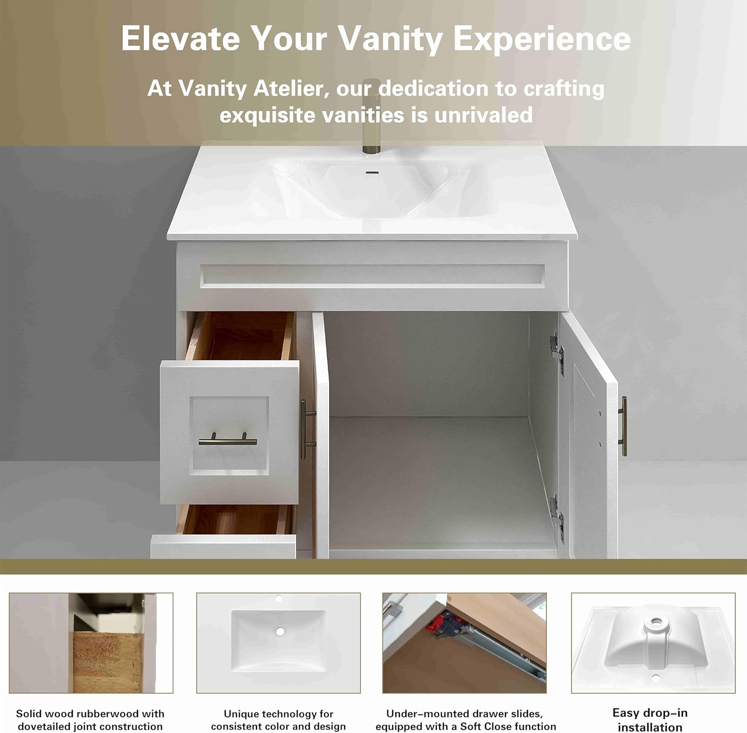 36" White Shaker Bathroom Vanity with Sink – Solid Surface One-Piece Top, Soft-Close Doors, Polyurethane Nano Resin Sink, Pre-Drilled Faucet Hole, Modern Bath Vanity Cabinet Set