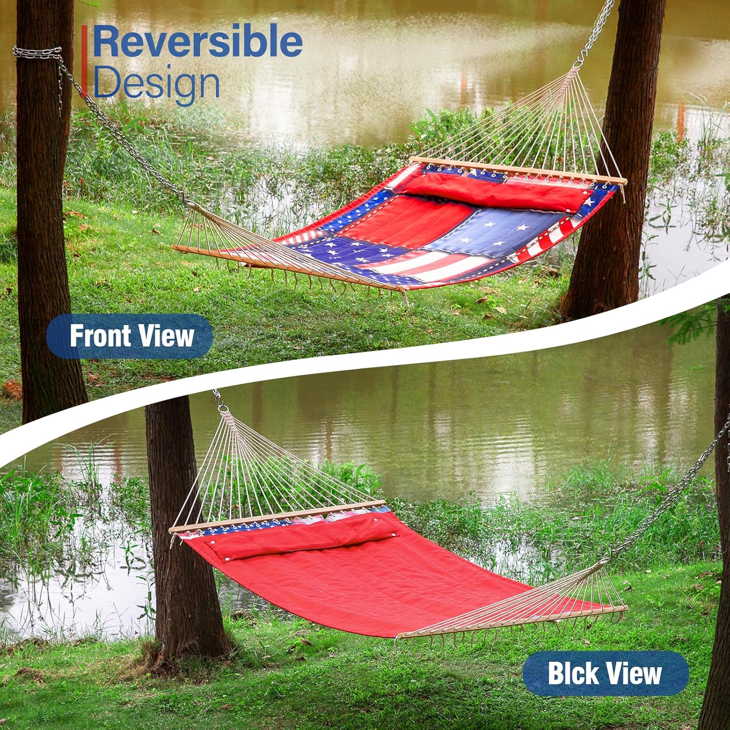 Backyard Expressions Reversible Quilted Hammock - Single or Double Hammock for Outdoor Relaxation with Matching Pillow, Flag Patchwork