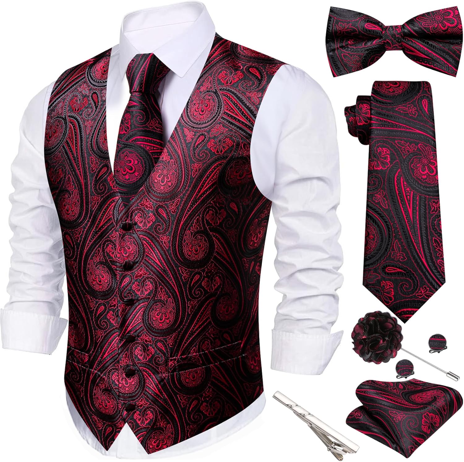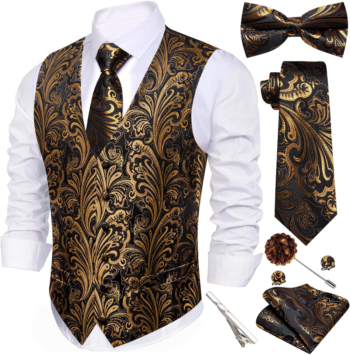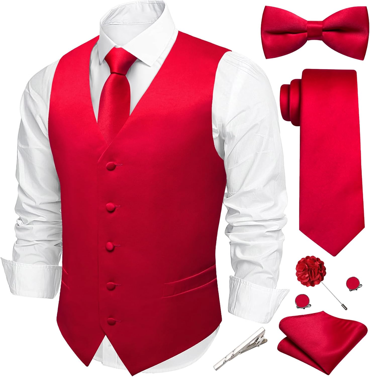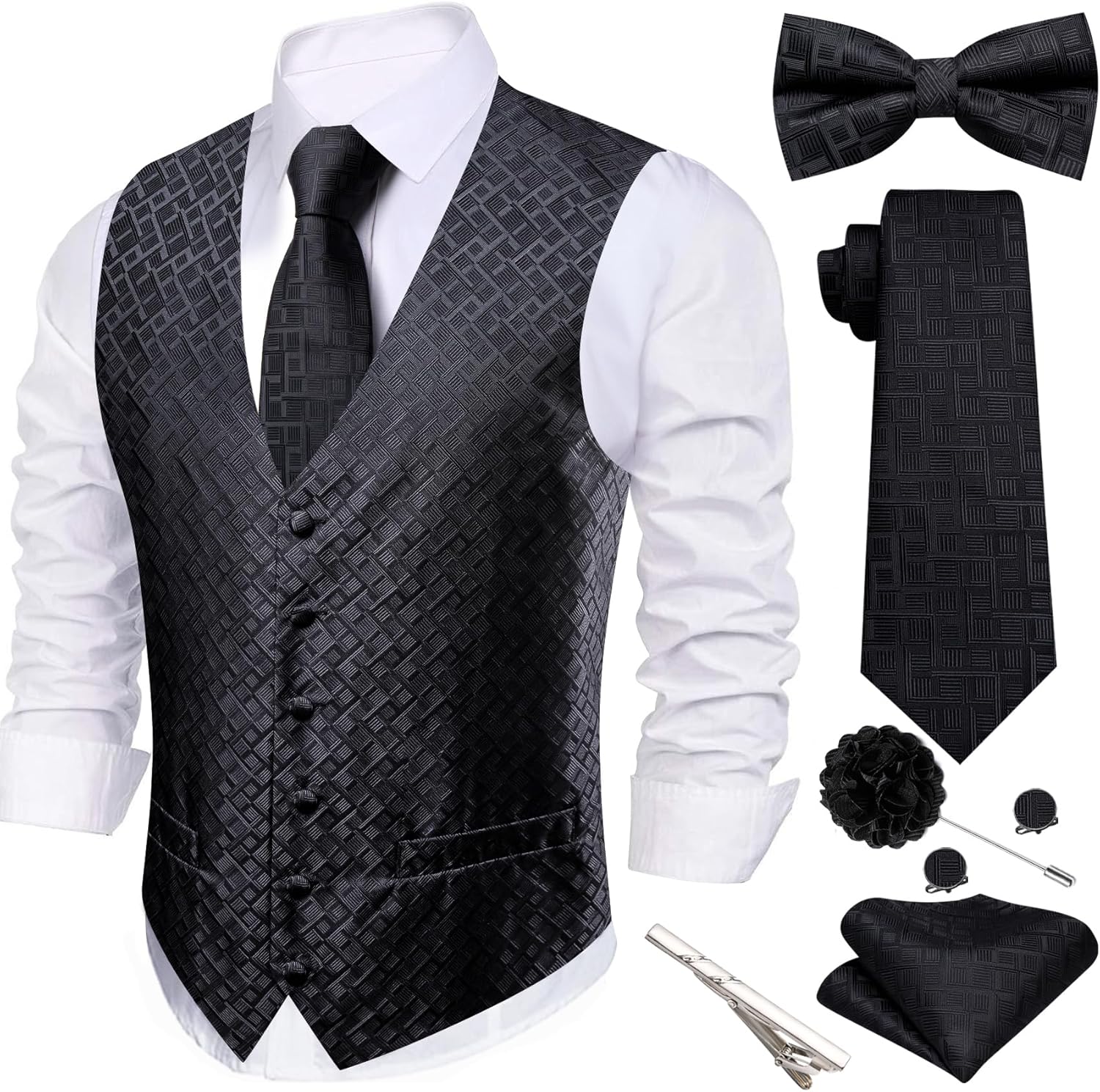 Men's vest+necktie+pre tied bowtie+hanky+cufflinks,5PCS fancy V-neck vest set for wedding party business.