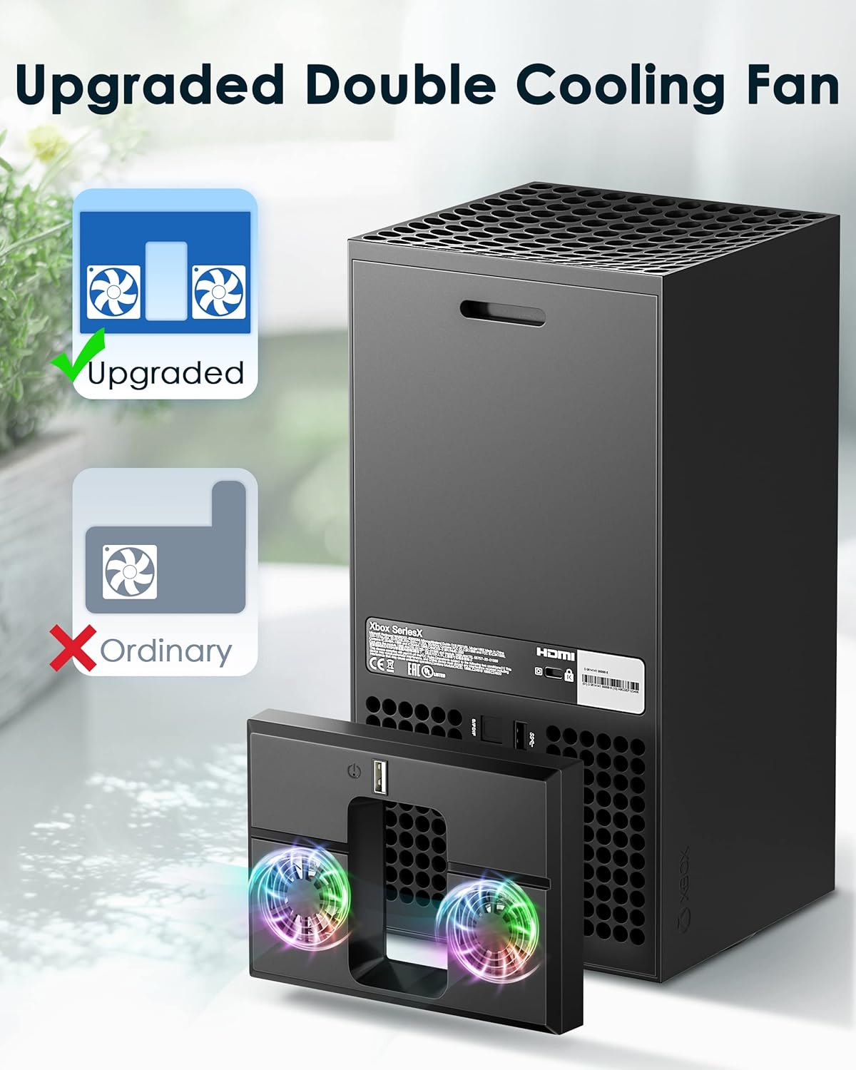 In the past, the console was often overheated due to playing games for a long time, which may interrupt the game and affect the performance of the console. ZAONOOL cooling fans are designed for series X consoles. We hope to create a better cooling fan for gamers, so we have upgraded the function and performance of the cooling fan. If we don't think it's an absolute good product, we won't endorse it. We are very proud to created this cooling fan for you, and create a stress free environment to provide the best game experience for you. Designed for Series X game console. Upgraded Dual FanBuilt-in 2 high-speed cooling fans, and the fan speed is up to 5300RPM, which is the largest wind power on the market. Cool Console QuicklyWhen this fan runs, the hot air is exhausted from the top of the console, which can cooling your console quickly to a suitable temperature, preventing your console from overheating and interrupting the game and prolonging the life of your console. Low Noise Noise below 30db when this cooling fan runs.Easy to Install and UseJust connect the USB port on the back of this fan to the console, and the fan will runs, no require extra power supply.Extra USB PortThere is an extra USB port on the front of this fan, which can quickly charge your controller and other electronics. Super Cool RGB LED Lights DesignThere is an RGB light strip inside each fan. When the fan runs, this fans on both sides will display 7 different colored light, which can increase the gaming atmosphere and provide you with the best gaming experience.