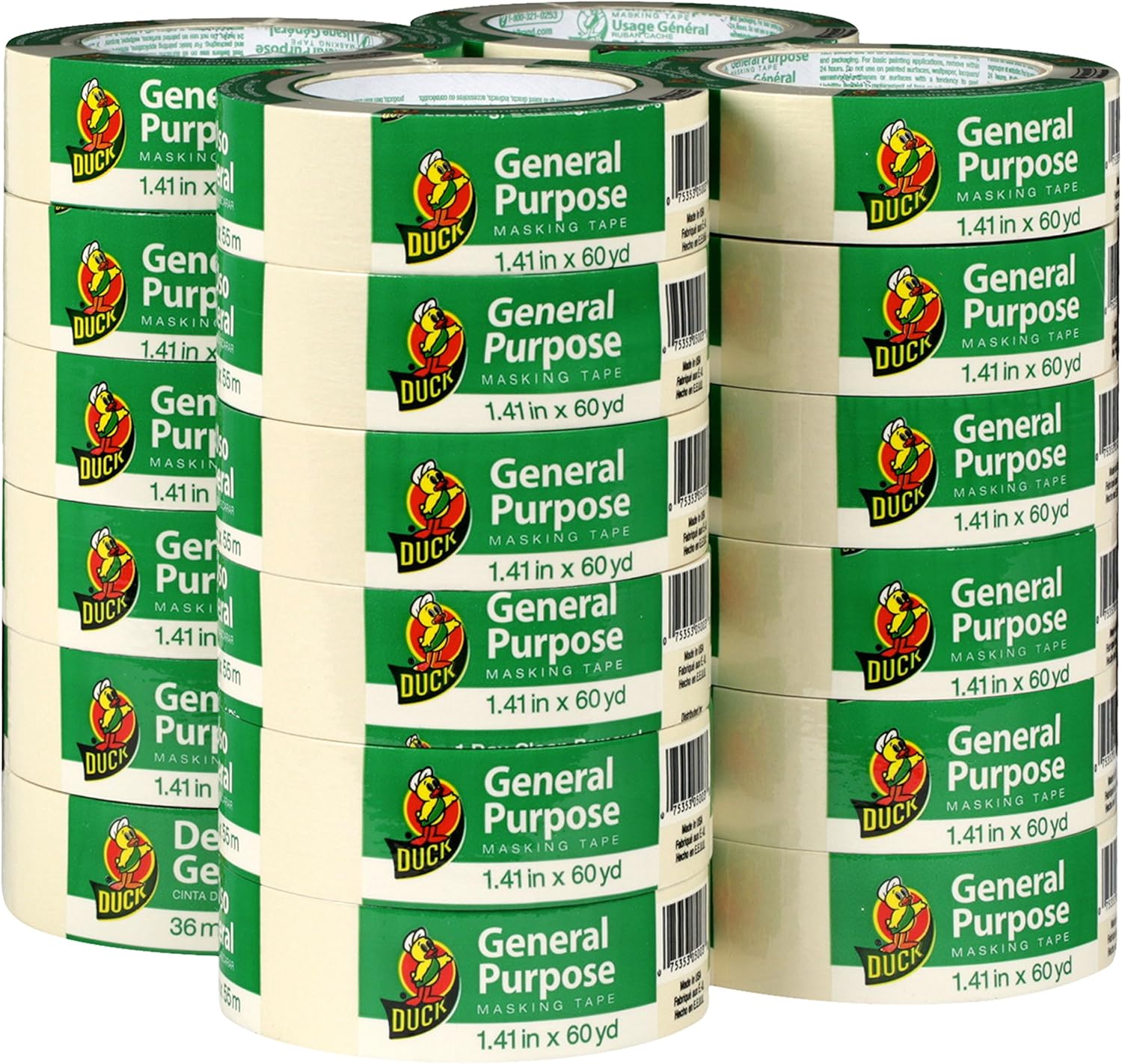 Duck Brand General Purpose Masking Tape has a synthetic rubber-based adhesive with an excellent high tack for quick sticking to a variety of surfaces. It has good resistance to oil, water and low temperatures and is ideal short term masking, general labeling, bundling, packaging and non-critical painting applications. This general purpose grade masking tape removes cleanly from surfaces for up to 24 hours. Got a project? Get the Duck to do it.