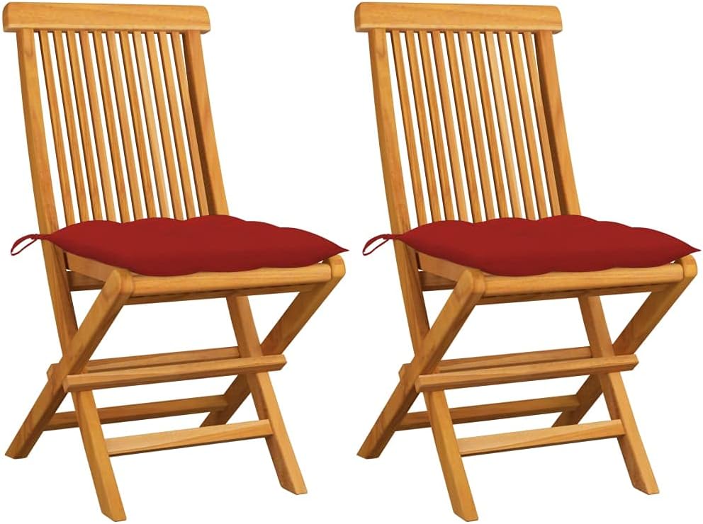 These wooden folding patio chairs, featuring a simplistic yet elegant design, is meant to bring you comfortable seating experience.Constructed from extremely durable teak hard wood, this piece of furniture has been seasoned, kiln dried and then fine sanded give very smooth appearance. Teak wood known for its exceptional strength weather resistance, making it far more suitable than any other kind wood. the perfect choice if want purchase long lasting furniture.The surface easy clean with damp cloth. These dining chairs are also lightweight, them completely flexible move around. The outdoor can be easily folded when not in use. Additionally, thickly padded seat cushions provide extra comfort.Cushion color: RedMaterial: Fine waterbase finishCushion material: 100% polyesterDimensions: 18.5" x 23.6" 35" (W D H)Seat depth: 14.6"Seat height ground: 18.1"Cushion dimensions: 15.8" 2.8" (L W T) Delivery contains: 2 Garden chair2 Seat cushion