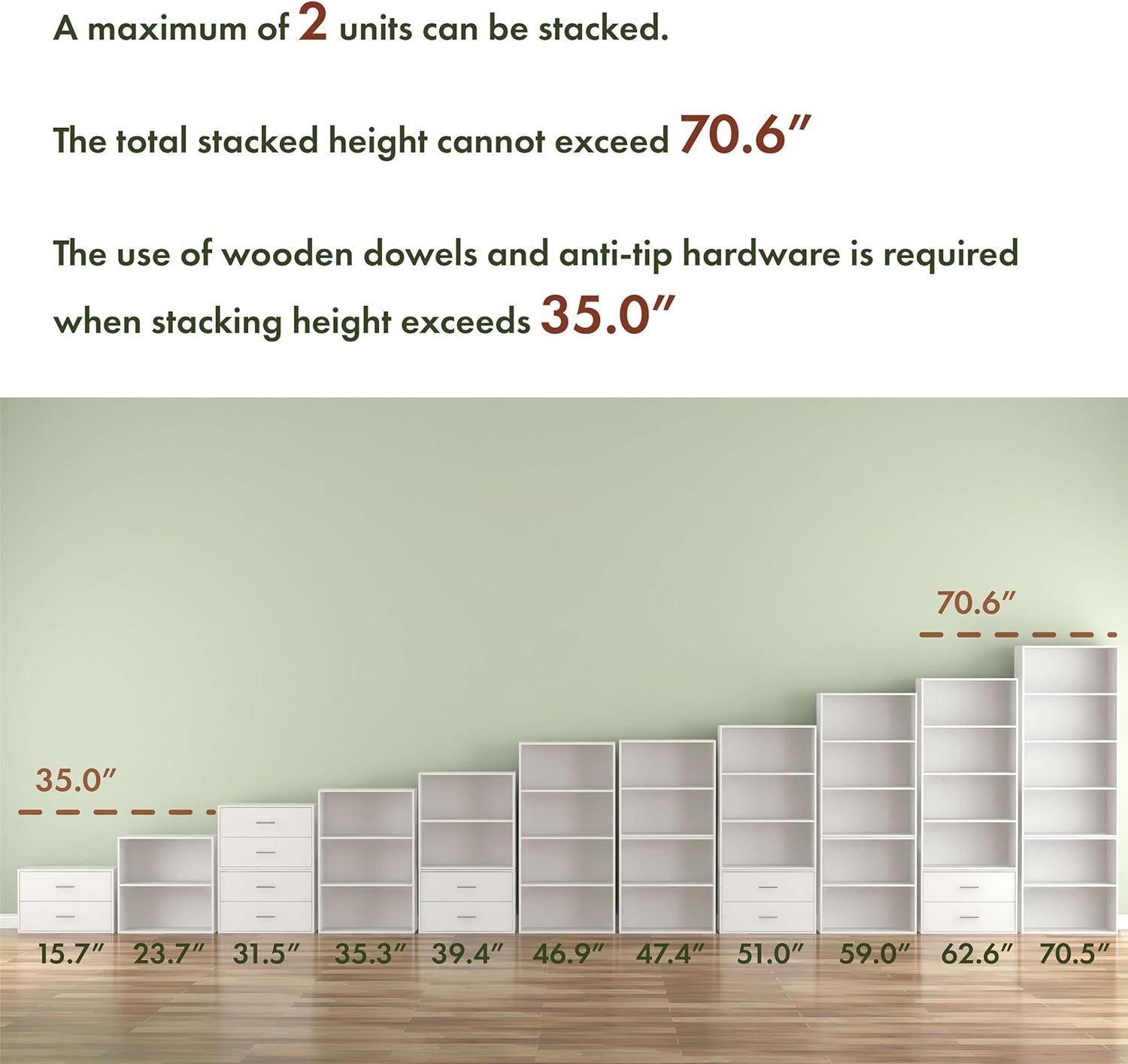 Stackable Bliss and Style: Elevate Your Space with Cube Storage Freedom!Dive into creative freedom with our cube storage shelves, turning large rooms into storage sanctuaries or making the most of cozy corners. Bid farewell to clutter and experience the perfect fit – our book shelves accommodate 11 x 11 x 11-inch cube bins, standing books, and documents with ease. Storage solutions just got a vibrant upgrade!In the Realm of Storage, Quality Prevails:Explore our exquisite cubby storage organizer crafted from top-tier engineered wood, tested for strength and longevity. The wood-grain print on the surface adds an artistic touch, showcasing the details of this elegant book case.Safety Guidelines for Stacking:(1) Keep it simple – don't stack more than two items.(2) Strengthen your setup – use the included wooden dowels and anti-toppling hardware for added safety.(3) Reach for the stars, but not too high – maintain a stacking height under 70.6".Product Collection (Width x Depth x Height):【Open Cube】2-Cube| 12"W x 11.7"D x 23.7"H3-Cube| 12"W x 11.7"D x 35.3"H4-Cube| 23.6"W x 11.7"D x 23.7"H6-Cube| 23.6"W x 11.7"D x 35.3"H【Open Tier】2-Tier| 23.6"W x 11.7"D x 23.7"H3-Tier| 23.6"W x 11.7"D x 35.3"H4-Tier| 23.6"W x 11.7"D x 46.9"H【Closed Storage】3-Tier (Doors)| 23.6"W x 11.7"D x 35.3"H2-Drawer| 23.6"W x 11.7"D x 15.7"HSize-Savvy Stacking TipOur storage units are available in 12-inch and 23.6-inch widths.For stable and secure stacking, pair units of identical widths.This simple trick ensures your storage setup is both elegant and efficient. Have a question or need assistance? Contact us before starting a return—we’re here to help! 📞 Customer Service: 888-980-5122 📧 Email: cs.ec@foagroup.com We’re dedicated to finding the best solution for you!