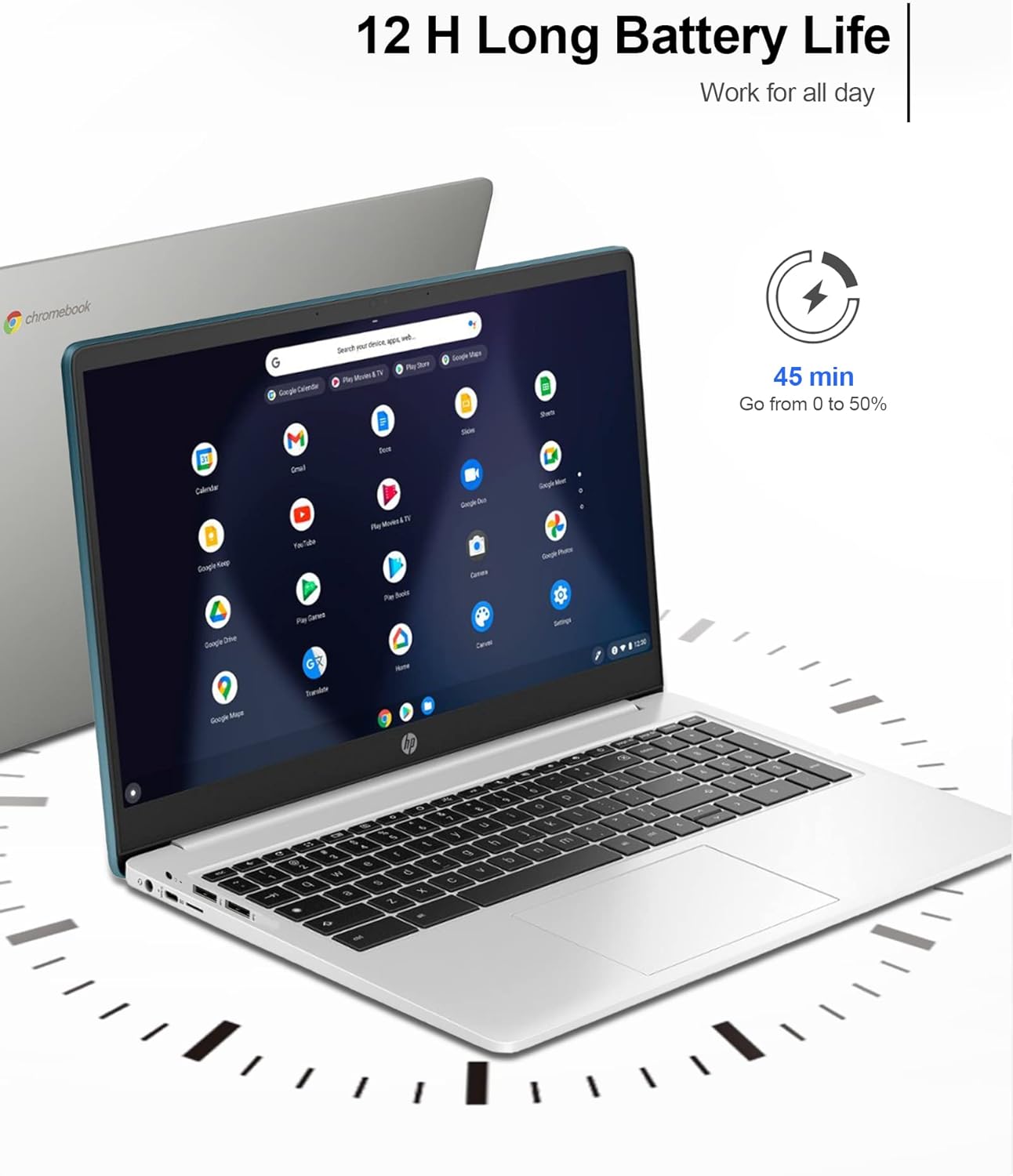 15.6" Chromebook - Intel Processor N200 The Chrome OS is perfectly paired with the reliable performance and intuitive design of the HP Chromebook 15.6 inch. With an all-day battery life, oversized touchpad plus a numeric keypad, be equipped to conquer the world. Enjoy the vibe on a 15.6 inch diagonal, HD display, and pump up the volume with dual-stereo speakers. With the seamless integration of the Google ecosystem, Chrome OS gives you a fast, simple, and secure online experience with built-in protection and automatic backups for worry-free browsing. FeaturesProcessor: Intel Processor N200 The perfect combination of performance, power consumption, and value helps your device run smoothly and reliably. Easily browse and download with four processing cores to meet your multitasking needs.Type of Memory (RAM): LPDDR5 Memory: 8 GB RAMSubstantial high-bandwidth RAM to smoothly run your games and photo- and video-editing applications, as well as multiple programs and browser tabs all at once.Internal storage: 64 GB eMMC + 128 GB MSD CardAn embedded multimedia card provides reliable flash-based storage.Graphics: Intel UHD GraphicsSmoothly stream 4K content and play your favorite games in 720p, without the need for a dedicated graphics card.Wireless: Wi-Fi 6 and Bluetooth 5.3 Stay connected to Wi-Fi and to Bluetooth accessories with wireless technology.Camera ShutterEnsure your privacy with a visible shutter that turns off your PC’s camera.Camera: HP Wide Vision 720p HD camera with temporal noise reduction and integrated dual array digital microphones88-degree, wide-angle field of view for video chats with the whole family.Dimension: 14.28" x 9.51"x 0.78", 3.81 poundsPorts: 1 x USB-A 3.1 2 x USB-C 3.1 1 x Headphone JackHP Fast Charge: Go from 0 to 50% charge in approximately 45 minutes.Battery Life: Up to 11 hours and 30 minutes Operating SystemChrome OSGoogle Everything Button: It’s one button that helps you find what you need fast. Like files. And apps. And answers online. Press it, and get what you need — all from one place. Voice Assistant Built-inGoogle AssistantColor: Mineral SilverManufacturer's Warranty: 1 year