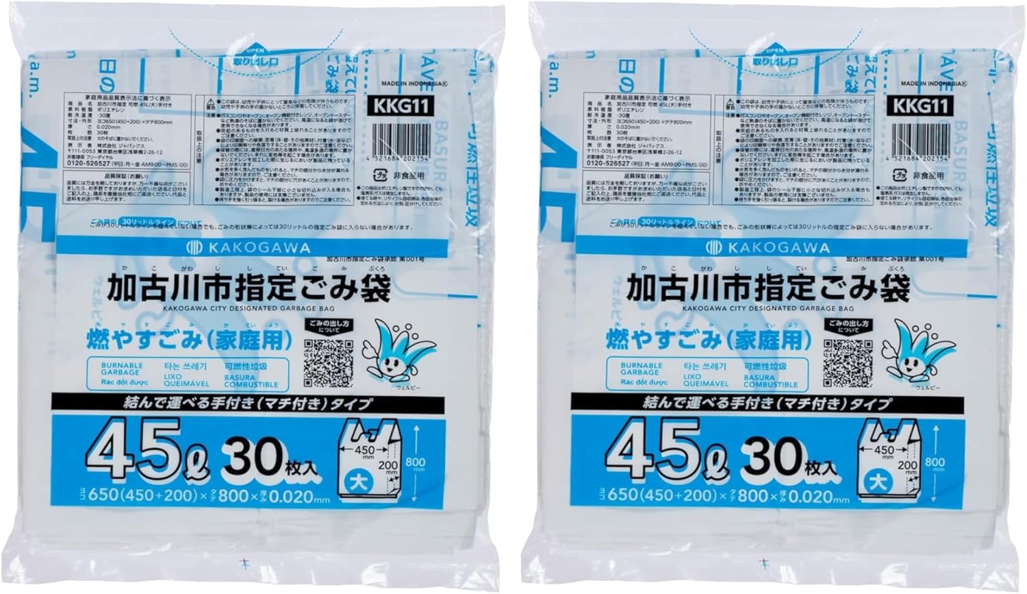 Product Specifications: Kakogawa City designated combustible waste bag. Handheld. ● Printed individually. Comes with 30L line. The texture of the sharky type garbage bag. Precautions for Use: ● This bag may present choking hazards to infants and children. Keep out of reach of infants and children. Please be aware that if you insert objects with protrusions may tear over the material. This is a flammable product, so please do not place it near fire. ● Please do not rub as the color of the garment may cause friction.