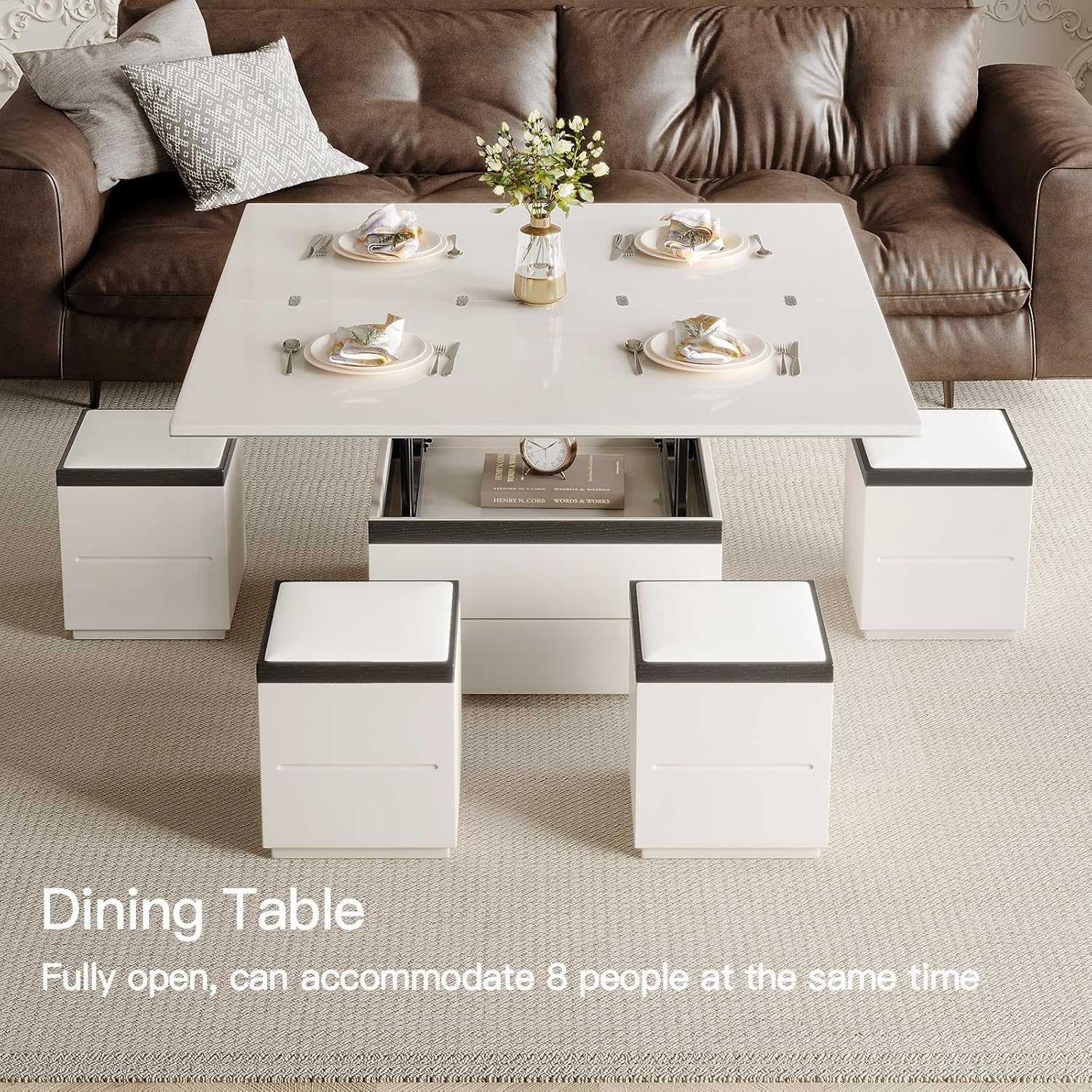 Lift Top Coffee Table with 4 Storage Stools, Rising Tabletop Center Tables, Expandable Dining Tables with Compartment and Drawer, Modern Office Desk End Table, White, 47.24" L