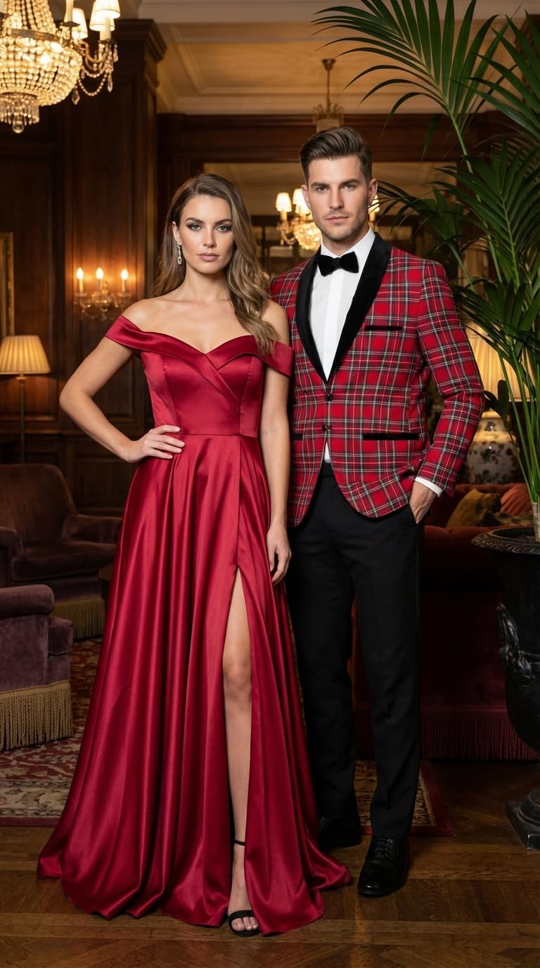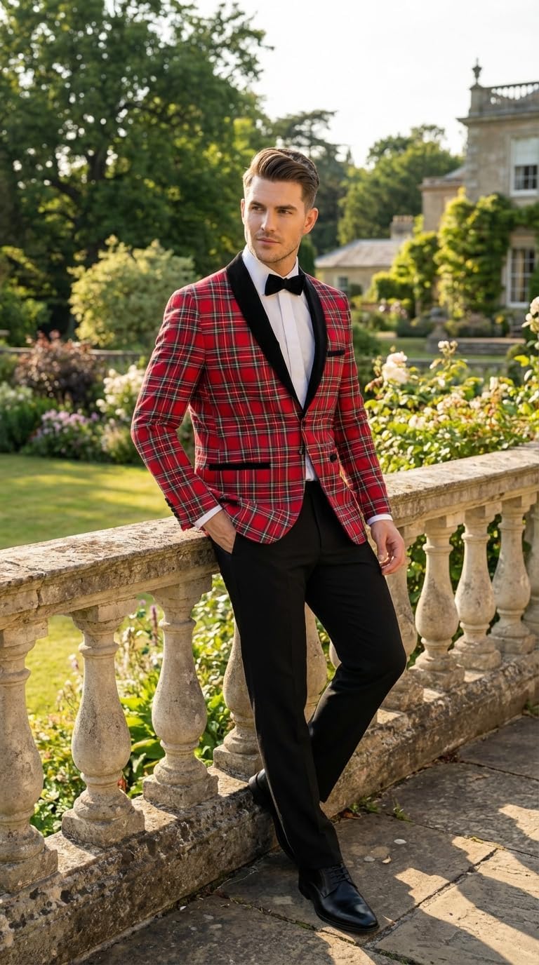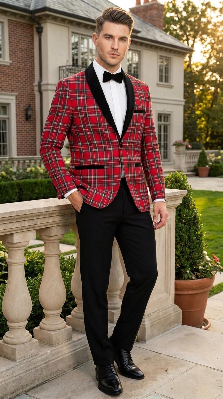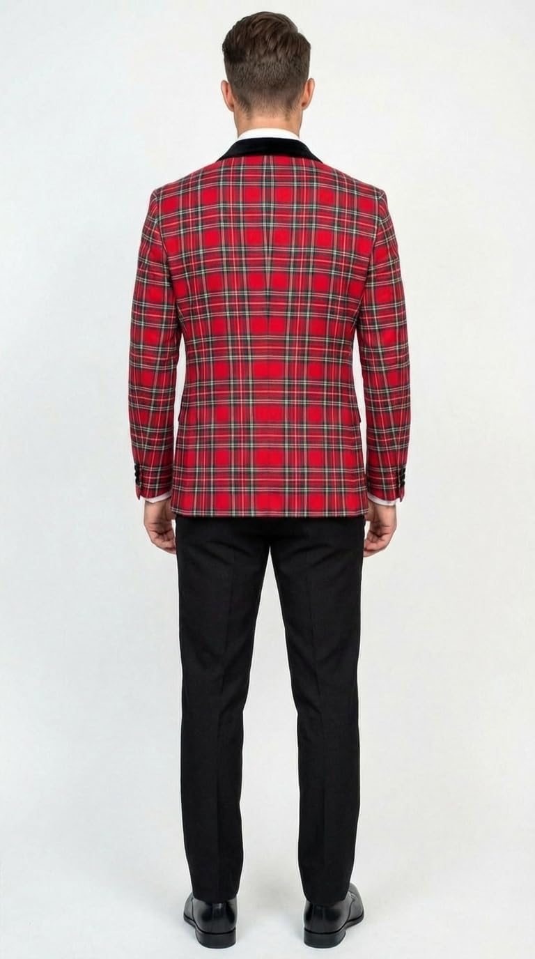This tuxedo features a 2 button closure with a shawl lapel. It comes in a modern fit, with side vents, and a fancy fabric. Perfect for any prom or wedding. Matching Flat Front Pants. The Mens Tartan Plaid Christmas Holiday Blazer in Red is the perfect blend of festive charm and refined style. Featuring a classic red tartan plaid pattern, this blazer radiates holiday spirit while keeping you sharp and stylish. Designed with a structured fit, notched lapels, and a tailored silhouette, it balances playful seasonal flair with gentlemanly sophistication.