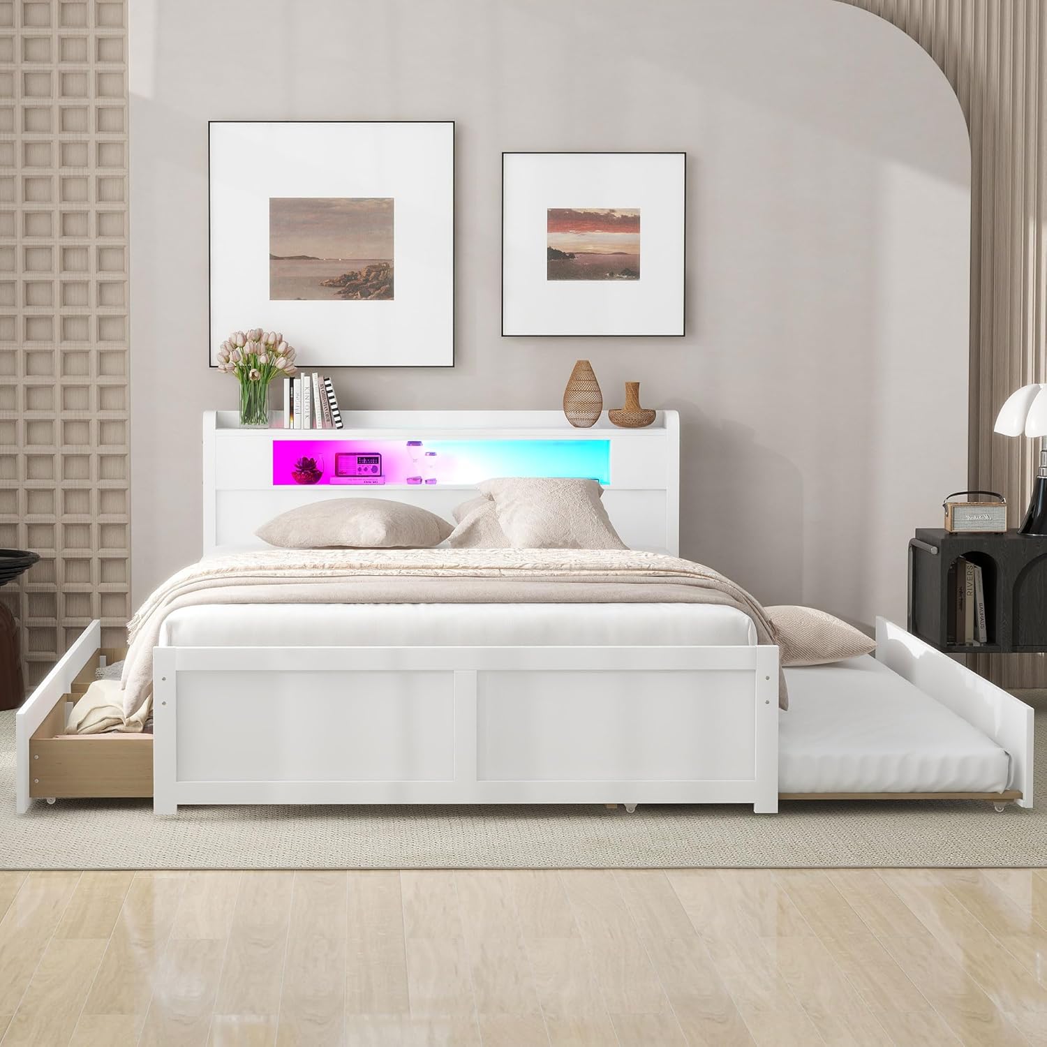 Queen Size Wood Storage Platform Bed with LED, 2 Drawers and 1 Twin Size Trundle.Slight variations in size may occur due to manual measurement.The images on our website are for reference only. The product may appear slightly different due to lighting or screen settings.For the best fit, please review all specifications and dimensions before purchasing.Thank you for your understanding!