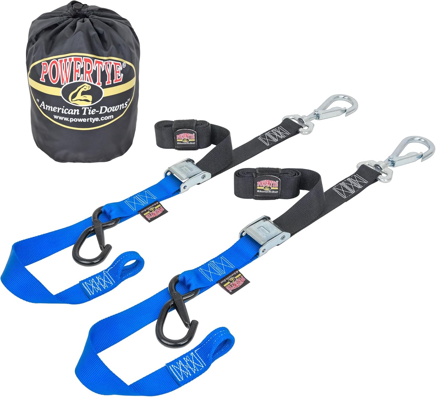 These provide a CONVENIENT and SECURE way to tie down lighter vehicles like scooters and dirt bikes. Comes with one pair of our 1.5 inch Fat Strap Soft-Tye Tie-Downs and one small storage bag. The tie-downs are a standard 6 ft length and come with our Large Swivel Latch hook, which can be used at any angle and fits around tubing up to 1 inch diameter. Also includes one rubber-coated Latch Hooks for an extra-secure hold. The Integrated Soft-Tyes protect paint and chrome surfaces, keeping the hooks away from your bike. Great for those tougher applications where a 1 inch Powertye just isn't enough. These tie-downs are also ideal for thicker Pro-Bars or a tight area not suitable for hooks. Integrated Adjustable Webbing Wrap holds excess webbing organized during transport or storage.