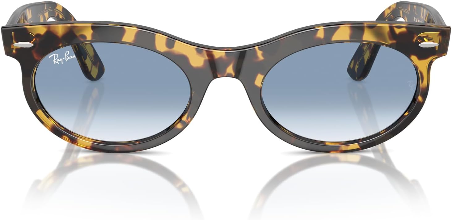 Look smart and stylish wearing Ray-Ban 0RB2242 Wayfarer Oval Sunglasses, featuring an oval, yellow havana frame with clear/blue gradient lenses and classic metal front rivets. The sunglasses combine bold aesthetic and a narrower lens shape, plus the UV protection lens coating keeps you protected from harmful sunrays. Plastic frame. Crystal lens.