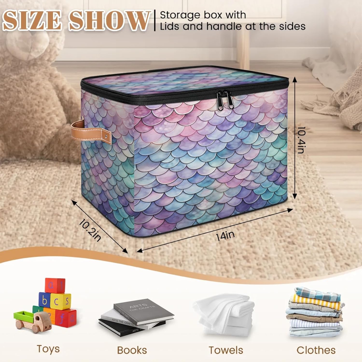Storage Bins Size: 15(L)x 11(W)x 9.5(H)inches. Large capacity storage basket, can hold a lot of things, save space, also can prevent things messy, keep the home and room clean and orderly. Multi-function: Foldable storage box can be used as closet organizers, toy storage, shelf basket, blanket basket, storage box, laundry basket, wardrobe basket, clothes storage bins, bathroom baskets, under bed storage containers and so on. Can store toys, blankets, books, clothes, quilts, socks, shoes, all kinds of items, can be put anywhere you want. Various Occasions: Storage boxes are suitable for closet, shelf, bedroom, closet, kid's room, bathroom, nursery, laundry room, living room, dormitory, apartment, office, locker room, pantry, balcony, living room, kitchen, game room and other occasions. Practical Gifts: The clothes organizer is a thoughtful choice for birthday parties or Christmas, Mother's Day, Father's Day, Valentine's Day, Easter, etc., for mom, dad, him or her, friends or colleagues.